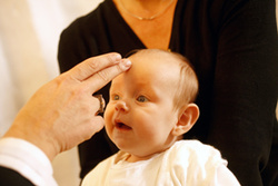 Præsten øser lidt vand på barnets hoved tre gange – for Gud, søn og Helligånd – og velsigner barnet.
